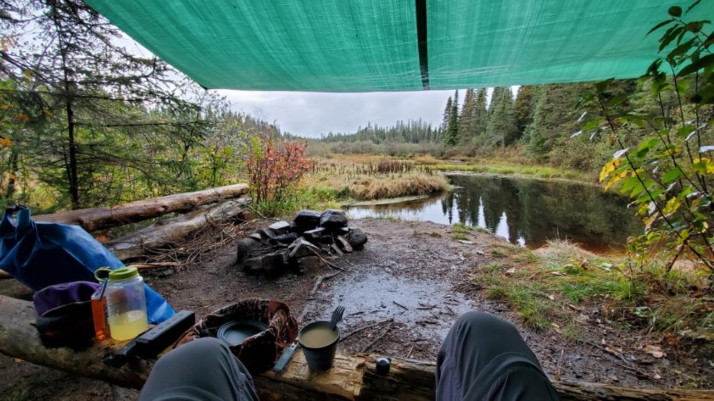 At 1pm I decided to push forward to the next campsite. It was still raining, but not as hard. After just a few minutes of paddling, I arrived at P460. A quick double carry and I re-launched on the Tim river for the final stretch of the day. Finally, at 4pm I arrived at my home for the night – and like yesterday, the campsite didn’t look too appealing from the water, but it turned out just fine. It was still overcast so the first thing to happen was hanging the tarp. You want to know how to bring the sun out? Hang a tarp. Works every time. The sun made an appearance and stayed out for the rest of the day.
