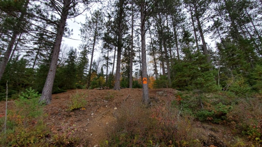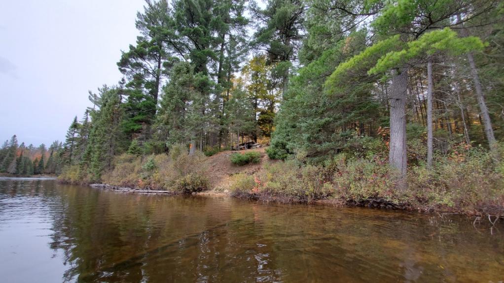 Eventually I reached Sittingman Lake and didn’t waste any time getting to the next muddy trail to Bog Pond. While crossing P560 to High Dam Pond, I couldn’t help but think there is no way this trail is 560 meters – it just kept going and going. According to the GPS it’s 573m so I’m not sure why it felt so long. Maybe because it was raining, the trail was muddy (seems to be a theme for this trip) and the fact that my feet were wet. I launched and kept going. When I reached the end of P230 the rain was really coming down. When nearing the end of the trail, I passed a giant white pine that managed to keep the ground under and around it completely dry, despite the downpour. I finished the trail, put down my canoe, dropped my pack and placed my canoe over it to keep dry, then I retreated back up the trail to sit under the giant white pine. I spent just under an hour waiting out the rain and it showed absolutely no sign of stopping. I finally accepted my fate of getting soaked on the final stretch of the day and launch onto Longbow Lake. It was raining hard but the silver lining was no wind. I pulled over a couple times to hide under some cedars during the heavy downpours.