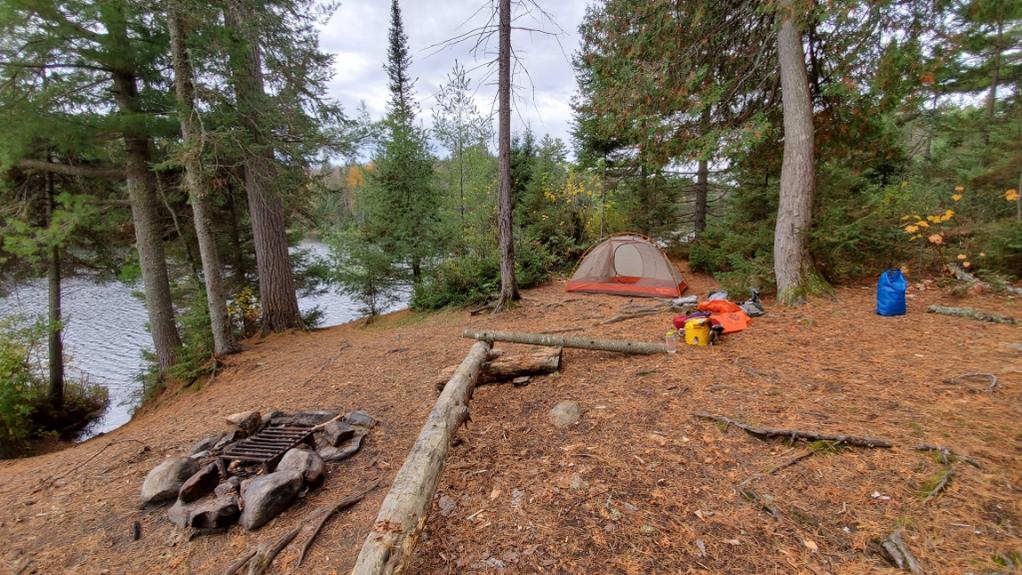 I wasted no time setting up camp and walked around the campsite looking for firewood – guess how much I found? I’ll give you a hint: bagel. No worries, this is expected when it’s late in the camping season and I have a little trick for these situations: Get in your canoe, paddle to ANY random spot that isn’t near a campsite, portage, or easy in/out. Guaranteed you’ll find plenty of dead, dry firewood just laying around the forest floor – and that’s exactly what happened.